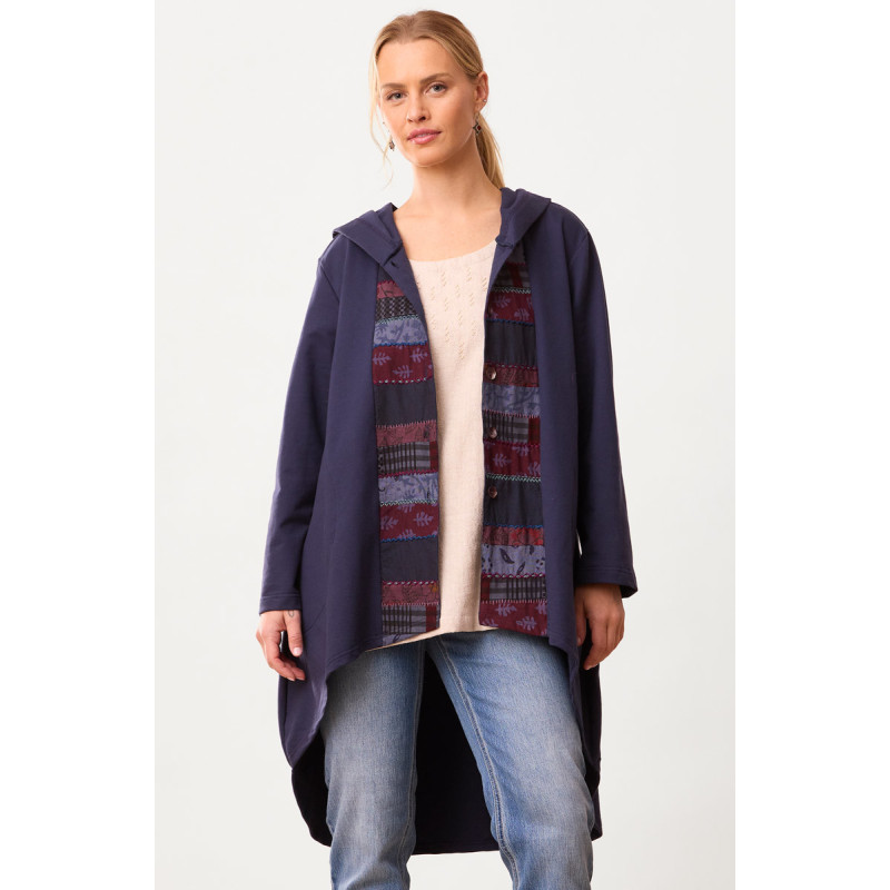 A French terry hoodie with an elevated mixed-media flair. The dark blue knit A-line cover-up features a hand embroidered upcycled Chindi patchwork placket so that you can button-up in style! The graceful high-low curved hem gives a great sweep. Curved side pockets are defined with a decorative seam. Chindi patchwork colors and patterns may vary due to the variety of upcycled fabrics.