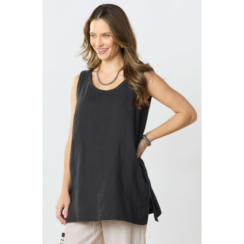 Stylish and comfy, our basic black soft double gauze tank top goes with everything. Side slits give an easy sweep. Tone-on-tone hand embroidery embellishments. Longer length makes this ready to wear alone or layered.