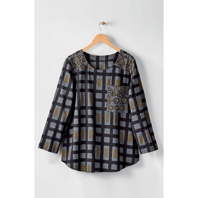 Our signature MarketPlace top in muted blue, green and charcoal black block print. Contrasting chest pocket and shoulders are embellished with hand embroidery. Shirttail hem and side slits.