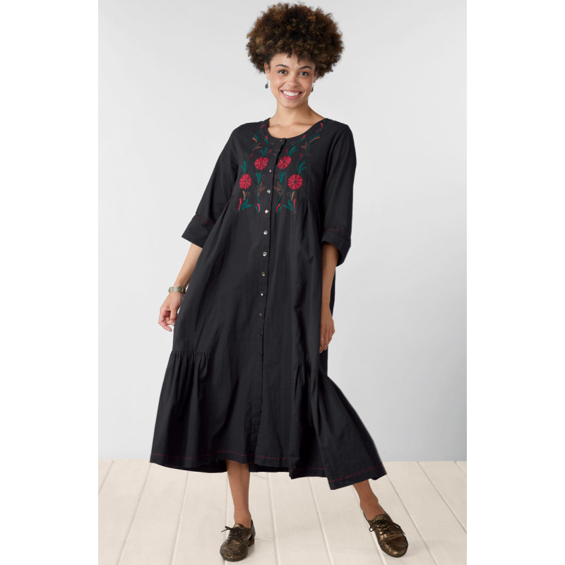 Embroidery artistry defines this eco-friendly organic cotton long dress with the unique side panel flounces. Red and teal hand embroidered florals decorate the front yoke. Generously cut - consider sizing down for a less oversized look.