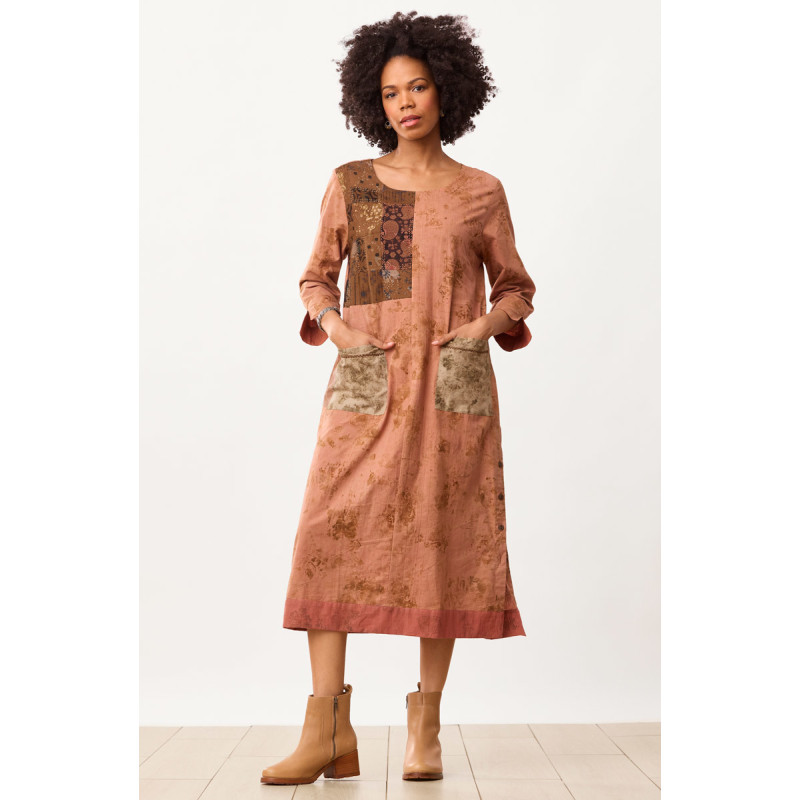 Our eco-friendly organic cotton shift dress in subtle autumn colors has an upcycled Chindi patchwork panel and seam button detail in the left side. The handprints have been created by skilled artisans who steam onion peels directly onto the fabric to transfer their design and color. Hand embroidery accents the Chindi panel and contrasting green front pockets. The style is unique, and each dress is unique! While the dominant color is brown, the Chindi patchwork colors and patterns may vary due to the variety of upcycled fabrics.