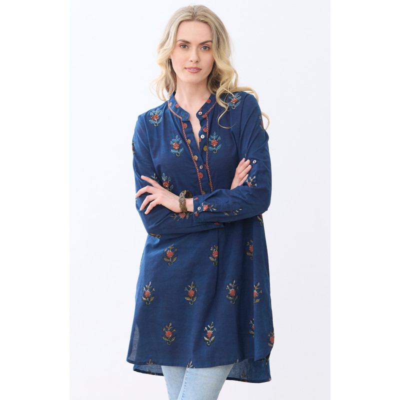 Easy kurta styling in this soft, lightweight cotton long shirt handprinted in natural dyes of true indigo, rust-red and green. Contrast band collar and button placket are outlined with hand embroidery, plus expert hand embroidery embellishes the print design. High-low shirttail hem. Long sleeves are ready to roll up. This tunic is great for layering!