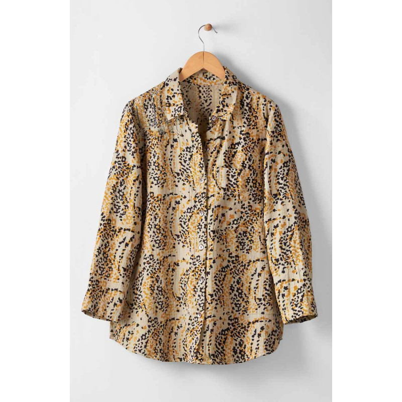 Easy shirt styling in our soft and comfy double gauze. Black and gold block print on muted green, with hand embroidery embellishments on the shoulder. Shirttail hem, side slits.