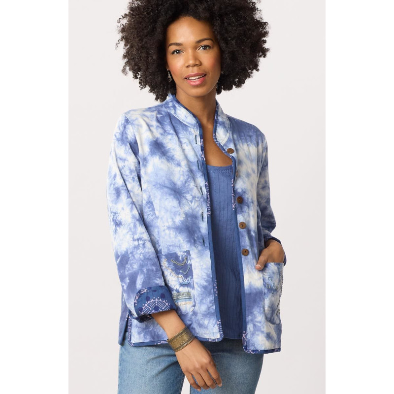 Two-in-one reversible button-front jacket. Blue shibori tie-dye on cotton twill reverses to a resist block print in shades of blue. Both sides feature princess seaming and front patch pockets. Stand collar and sleeves ready to cuff. Hand embroidery embellishes the pockets on the Shibori side and the shoulders on the block print side. Fits true to size.