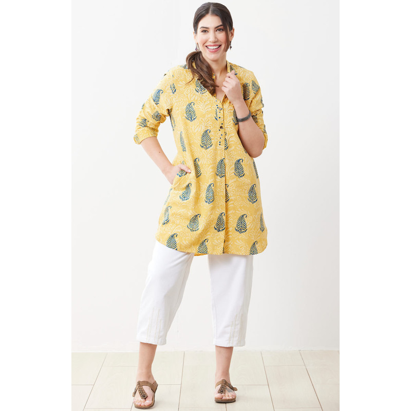 Handwoven eco-friendly recycled-yarn denim flood-length pant with a flattering barrel-leg silhouette in versatile, goes-with-everything white. Perfect for both casual days and dressing up, this piece is definitely denim! Designed with an elastic waist for all-day comfort and featuring back pocket embroidery for added detail. A durable and sustainable choice, hearty denim handwoven with recycled fibers blends strength and eco-consciousness. The handwoven texture adds a unique artisanal touch, while the incorporation of recycled materials reduces waste.