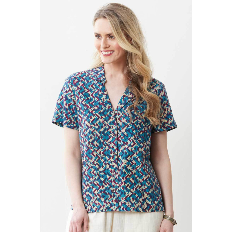 Classic camp shirt styling makes a statement in batik and block prints of marine blue and maroon. Hand embroidery accents on shoulder and pocket.