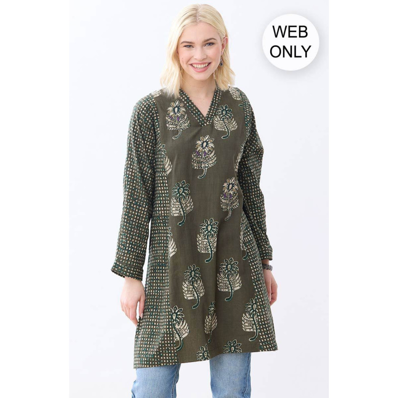 Grey-green V-neck kurta tunic has coordinating Dabu handprinted front and back panels. Hand embroidery accents the print design. Deep side slits. Generously cut - consider sizing down for a less oversized look.