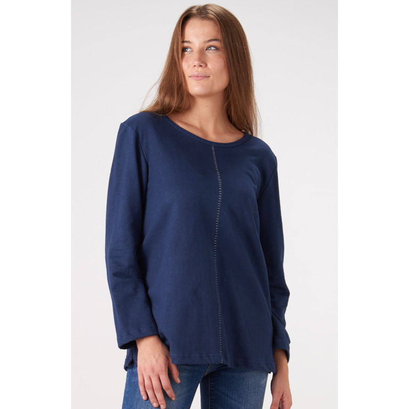 Ready for everything: our soft French terry top will be your new cool weather favorite. Hand embroidered seam detail. Side slits.