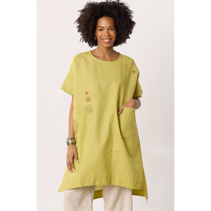 Generously sized dropped-shoulder long shirt in a yellow-green linen/cotton blend. Easy styling with a longer hem in back and deep side slits for a great sweep. Colorful hand embroidery highlights. Perfect for a cover-up!